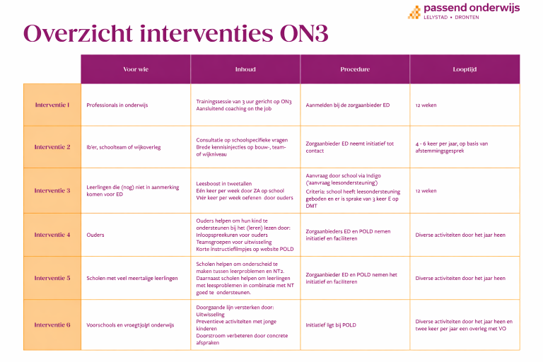 Uitgaande van de knelpunten die ervaren worden heeft POLD samen met de zorgaanbieders dyslexie zes interventies ontwikkeld. Zo ontstaat een doorgaande lijn van leesondersteuning: van preventie tot vergoede dyslexiezorg.