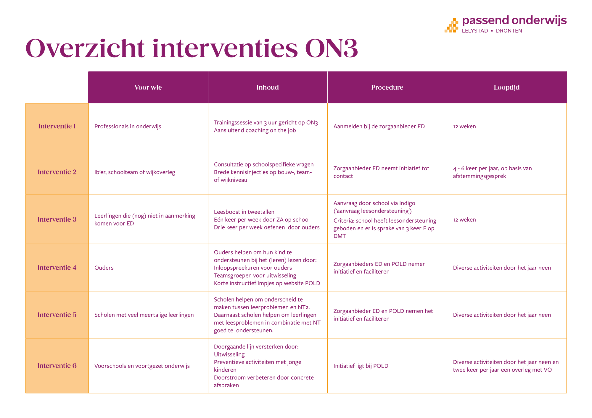 Om jaarlijks zicht te krijgen op de behoeften van scholen en leerkrachten en om te kunnen beoordelen of de extra investeringen op ON3 en ON4 het gewenste effect hebben, is onder leiding van POLD de Lelystadse Monitor Leesondersteuning ontwikkeld. Bij de monitor wordt gebruik gemaakt van meerdere databronnen, waaronder het datasysteem van gemeente Lelystad, enquête onder leerkrachten en brongegevens van scholen. POLD is hierin projectleider. POLD initieert, monitort en analyseert de dataverzameling, waarna een eindrapportage wordt opgesteld en indien nodig acties worden ondernomen.